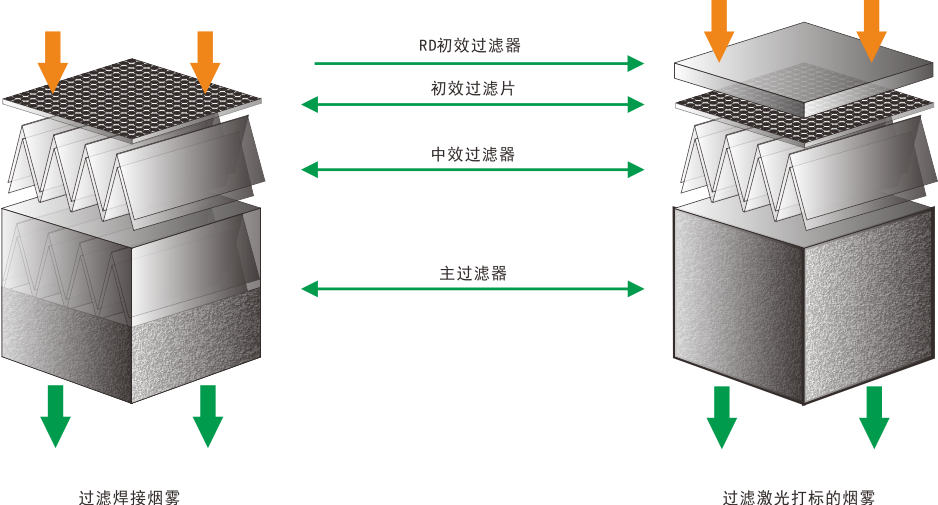 首先有害烟雾经过初效过滤片,滤除较大颗粒物质;